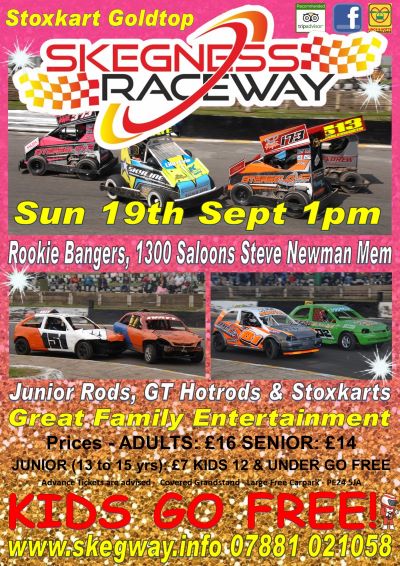 Details Bookings Meeting Format Prices, Times & More Last Updated: 19th September 2021 08:08 Preview 19th September 2021Rookie Bangers (non Honda mv), 1300 Saloons Steve Newman Memorial, GT Hotrods, Junior Rods, Stoxkart Gold Top Sunday 19th September 1pm (updated 19.09.21) Welcome to Skegness Raceway for day full of on track action. Main feature is the Stoxkart Gold Top Race. Racing also comes from Rookie Bangers, 1300 Saloons, GT Hotrods and Junior Rods. We are thrilled to be welcomed into the Trip Advisor Hall of Fame with our Certificate of Excellence, you really should be coming along to Skegness Raceway to be part of the excitement & fun that lots of people are talking about and have had a great time over the last few years. We are also members of Visit Britain and have completed their Covid-19 Industry Standard certificate. And have a 4.7 out of 5 rating on Google. Skegness Raceway boast fantastic facilities We have a large undercover Grandstand, extended in 2020, if you prefer to watch from outside, all around the arena is raised terracing so plenty of unhindered viewing. We also have Bars, including our family Raceview Bar, shops, catering, toilets, disabled toilets and baby changing facilities. Sorry there isn’t a cash machine at the raceway Large free carpark adjacent to the stadium Disabled parking is situated near the turnstiles (please don’t park in front of the gates), would recommend early arrival to secure a space. Trackside parking no longer available and there is also no longer a bus service to the stadium, we do have a free car park Note. Large quantities of food and drink are not allowed to be brought in to the Stadium arena. You may enter the Stadium with a small amount of food and non- alcoholic beverage suitable for one person’s consumption ie. Sandwich, packet of crisps and bottle of soft drink. We will not allow cooler boxes, holdalls, shopping bags, backpacks etc. filled with refreshments. Nor will we allow trays, packs crates etc. of soft drinks. STRICTLY NO ALCOHOL or GLASS. Alcohol will be confiscated If you have specific dietary requirements for health reasons, please bring a confirmation letter with you from your GP. We race in all weather conditions. Well behaved dogs on leads are allowed to be brought into the venue. No tents, shelters, gazebos, marquee’s, pop up tents or similar are allowed inside the Stadium Arena. Rookie Bangers 36 Brandon Pesterfield 39 Ryan Knibbs 44 Craig Law 51 Gavin Wing 81 Graham Minards 88 Lyndon Stark 93 Luke Nieuwenburg 94 Rory Bell 121 Aaron Colbert 144 Alfie Holstead 168 Tom Middleton 221 Jordan Storr 225 Taylor Overton 251 Lewis Wietrzyk 252 Kieran Wietrzyk 253 Trevor Doore 263 Curtis Streeton 277 Alex Tebbs 284 Mark Baggers 310 Harvey Latkowski 319 Leigh Dodes 320 Toby Hales 323 Billy Storr 361 Chris Walden 362 Katie Walden 399 Richard knibbs 550 Phil Jackson 551 Brett Jackson 564 Shane Coupland 591 Jack Giddings 611 Joe Greeves 702 Jordan Eagle 717 Lewis Ivatt 781 Tyrone Howe 787 Jack Elliott 792 Steve Greenhalgh 793 Owen Greenhalgh 795 Jack Brabben 858 James Bruce 878 Luke Rowland 888 Lloyd Stark 911 Shaun Coupland 949 Dave Coupland 993 Ryan Nieuwenburg 999 Nicky Walton 1300 Saloons 14 Harrison Careless Veall 18 Stuart Parnell 21 Steve Church 25 Stuart Hodson 28 Richard Smith 73 Aaron Hastie 110 Sam Lawie 111 Richard Smith 170 Chris Holland 171 Ben Kiddle 173 Ryan Atkin 211 Tom Birchenough 245 Cameron Brooker 288 Gavin Charlesworth 405 Josh hamstead 414 Mark Veall 420 Michael Campbell 453 Mike Mellor 468 Bradley Cooper 515 Lee Veall 704 Matt Dawson 812 Chloe Bell 925 Nick Casswell GT Hotrods 1 Brad Rouse 4 Nathan Bee 12 Matthew Ingle 20 josh machin 44 Ben Hills 73 Barry Disdel 74 Paul Overton 75 Luke Harrison 80 Gareth Ashton 99 Mark Campbell 156 Leigh Dixon 185 Nikisha Downs 200 Ryan Young 202 Mark Young 241 Stacie Greenwood 275 Matty Roberts 278 Marcus Brooks 337 Rhys Humphrey 398 John Reynolds 471 Colin Setchfield 512 Tony Leveridge 514 Sherrie Downey 703 Mick Cooper 777 Hazel Cooper Junior Rods 3 Lewis Wagg 12 Mia Ingle 13 Layton Wagg 14 Seb Clark 27 Alannah Clark 44 Harvey Law 88 Riley Bell 103 Cain Johnson 104 Emma Johnson 118 Jack Welsby 151 Lexi List 155 Kayley Dixon 234 Alfie Edwards 431 Jack Stevens 484 Lucas Lee 754 Daniel Nicholson-Howden 762 Josh Stanhope-Beresford 920 Kaelan Blakeman Buxton Junior Rods 20 Cairon Barton 61 Reece Hoggarth 84 Violet Crowden-Murfin 106 Charlie Plater 271 Jack Helliwell 393 Faith Fullwood 807 Lulu Crowden-Murfin Stoxkarts 1 Danny Nunn 4 Andrew Duddy 8 Matthew Lloyd 15 Liam Roche 21 Alex Butcher 27 Chris Butcher 28 Rob Key Snr 35 Graham Wheat 38 Claire Holden 55 Jack Moulson 67 Craig Hodgkins 77 Jessica Heath 81 Marc Lawson 111 Lee Sumner 157 Mark Osborne 169 Chloe Clarke 210 Jared Lindsay 212 Mathew Fenton 257 Kelvin Limb 260 Chester Love 265 Carl Nunn 282 Spencer Hundley 304 Nathan Topliff 313 Sara Royall 345 Thomas Andrews 357 Ben Limb 366 Matt Naughton 373 Mark Royall 380 Liam Powell 444 Kirsty Morris 492 Owen Anderson 515 Mark Broughton 528 Rob Key Jnr 610 Steven Roberts 708 Amy KiJewski 750 Hannah Andrews 791 Ryan Stuart 816 Bradley Lawson 889 Ellis Rogers 902 Dave Rodda 997 Luke Webb 19th Sept Race Format 1. Stoxkarts Teng Tools Gold Roof 2. Junior Rods 3. GT Hotrods 4. Rookie Bangers 5. Stoxkarts 6. 1300 Saloons Steve Newman Memorial 7. Junior Rods 8. GT Hotrods 9. Rookie Bangers 10. Stoxkarts 11. Junior Rods 12. GT Hotrods 13. 1300 Saloons AC1 14. Rookie Bangers 15. Stoxkarts 16. Junior Rods Final 17. GT Hotrods Final 18. 1300 Saloons AC2 19. Stoxkarts 20. Rookie Bangers Format subject to be confirmed please see the drivers notice board on the day Gates Open: 12noon Pitgate opens 10am Advance Tickets are now closed, its now all pay on the gate. We have a large capacity we won't sell out. If you have advance tickets please read all the info on the ticket page, your order number is important not your receipt number which is 8 digits long. Advance Tickets can’t b