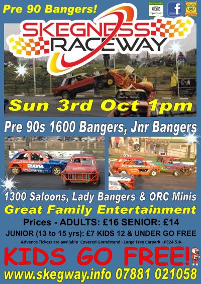 Details Bookings Meeting Format Prices, Times & More Last Updated: 03rd October 2021 08:24 Preview 3rd October 2021Lady Rookie Bangers, ORC Ministox, 1300 Saloons Sunday 3rd October 1pm (updated 03.10.21) Welcome to Skegness Raceway for day full of on track action. Advance sales are now closed. Its now all pay on the gate, we have a large capacity we won't sell out And a special event as we step back in time to Pre 90s with 1600 National Bangers in action, expect some old are rare cars from 30 years ago! Also racing are 1300 Saloons, Lady Rookie Bangers, ORC Ministox and as an extra we have added Junior Bangers We are thrilled to be welcomed into the Trip Advisor Hall of Fame with our Certificate of Excellence, you really should be coming along to Skegness Raceway to be part of the excitement & fun that lots of people are talking about and have had a great time over the last few years. We are also members of Visit Britain and have completed their Covid-19 Industry Standard certificate. And have a 4.7 out of 5 rating on Google. Skegness Raceway boast fantastic facilities We have a large undercover Grandstand, extended in 2020, if you prefer to watch from outside, all around the arena is raised terracing so plenty of unhindered viewing. We also have Bars, including our family Raceview Bar, shops, catering, toilets, disabled toilets and baby changing facilities. Sorry there isn’t a cash machine at the raceway Large free carpark adjacent to the stadium There is restricted access to the pits. Disabled parking is situated near the turnstiles (please don’t park in front of the gates), would recommend early arrival to secure a space. Trackside parking no longer available and there is also no longer a bus service to the stadium, we do have a free car park Note. Large quantities of food and drink are not allowed to be brought in to the Stadium arena. You may enter the Stadium with a small amount of food and non- alcoholic beverage suitable for one person’s consumption ie. Sandwich, packet of crisps and bottle of soft drink. We will not allow cooler boxes, holdalls, shopping bags, backpacks etc. filled with refreshments. Nor will we allow trays, packs crates etc. of soft drinks. STRICTLY NO ALCOHOL or GLASS. Alcohol will be confiscated If you have specific dietary requirements for health reasons, please bring a confirmation letter with you from your GP. We race in all weather conditions. Well behaved dogs on leads are allowed to be brought into the venue. No tents, shelters, gazebos, marquee’s, pop up tents or similar are allowed inside the Stadium Arena. Pre 90 1600 Bangers 10 Chris Wick 12 Troy Cobbett 26 Paul Lovick 43 Nicky Bishop 44 Craig Law 57 Max Stott 66 Liam Gelsthorp 68 Kyle Gill 88 Lyndon Stark 92 Nick Blakeman 192 Nathan Croston 195 Elvis Hopkins 203 Josh Moldjord 203 Martin Reeson 221 Jordan Storr 248 Nick Ashbridge 277 Alex Tebbs 284 Mark Baggley 321 John Weir 323 Billy Storr 352 Stu Brookes 385 Roy Gedge 460 Luke Tongue 551 Brett Jackson 577 Scottt Graves 633 Lee Hayward 737 Jason Griffiths 773 John Shaw 818 Lewis O Keefe 861 Rob Milner 868 Jorji Stark 887 Liam Stark 888 Lloyd Stark 1300 Saloons 14 Harry Veall 18 Stuart Parnell 21 Steve Church 25 Stuart Hodson 28 Richard Smith 99 Ross Clapton 110 Sam Lawie 170 Chris Holland 171 Ben Kiddle 288 Gavin Charlesworth 453 Mike Mellor 466 Alan Lakey 515 Lee Veall 704 Matt Dawson 812 Chloe Bell 925 Nick Casswell Lady Rookie Bangers 3 Kacey Smith 12 Kelly Skinner 43 Kirsty bishop 44 Ellie May Law 51 Megan Barnett 57 Sophie Tillow 151 Carley List 251 Chloe Wietrzyk 399 Jade Nicholls 512 Michelle Barnett 710 Kayleigh Seymour-Smalley 799 Charleigh curle 924 nickola breen 999 Kelly Walton ORC Ministox 55 Olivia Herzig 145 Rachel Kidd 167 Sam Cavanagh 178 Scott Allardyce 230 Kevin Stahr 368 Emily Santy 382 Corey Hunt 484 Dean Heeps 617 Christina Sillifant 627 Andrew Scott 970 Millie Farrell Junior Bangers 44 Harvey Law 150 Katelyn Parrin 234 Alfie Edwards 361 Kelsa Walden 455 Lexi Finney 515 Reagan flatters 609 Levi Murkin 622 Harvey Webb 644 Alfie Sime 702 Ben Kaleta 750 Rhys Parrin 869 jamie steele 3rd Oct Race Format 1. ORC Ministox Heat 1 2. Junior Bangers Heat 1 3. Lady Rookie Bangers Heat 1 4. 1600 Pre 90 Bangers Heat 1 5. 1300 Saloons Heat 1 6. ORC Ministox Heat 2 7. Junior Bangers Heat 2 8. Lady Rookie Bangers Heat 2 9. 1600 Pre 90 Bangers Heat 2 10. 1300 Saloons Heat 2 11. ORC Ministox Final 12. Junior Bangers Final 13. Lady Rookie Bangers Final 14. 1600 Pre 90 Bangers Final 15. 1300 Saloons Final 16. 1600 pre 90 Bangers DD Format subject to change Gates Open: 11.30am Pitgate opens 10am If you have advance tickets please read all the info on the ticket page, your order number is important not your receipt number which is 8 digits long. Advance Tickets can’t be used at the pitgate. Advance sales are now closed, its all now pay on the gate, we have a large capacity we won't sell out. Prices Adult £16 Senior £14 Junior £7 (13yrs to 15yrs) 12 years and under as always go Free and can be added in advance Adults 16yrs and above, Senior’s 65yrs & over, Junior’s 13yrs to 15yrs Card or cash can be used, card machine is the turnstile against the wall to the right as you look at the turnstiles. Sorry there isn’t a cash machine at the raceway. The event starts at 1pm, with the turnstiles opening at 11.30am the event usually finishes around 5pm to 5.30pm. Trackside parking no longer available and there is also no longer a bus service to the stadium. We do have a large free car park Well behaved dogs on leads are allowed to be brought into the venue.