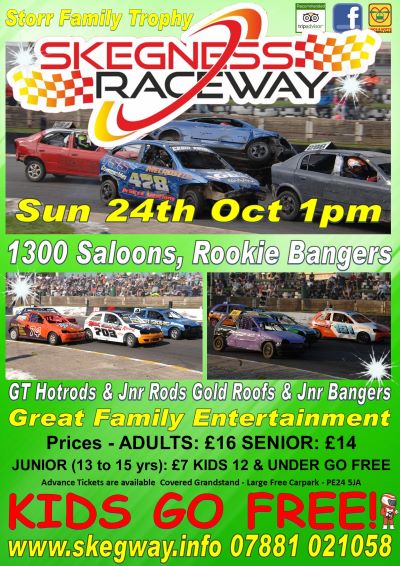 Details Bookings Meeting Format Prices, Times & More Last Updated: 24th October 2021 07:38 Preview 24th October 20211300 Saloons, Rookie Bangers (non Honda mv) Storr Family Trophy, Junior Bangers Sunday 24th October 1pm (updated 24.10.21) Welcome to Skegness Raceway for an Autumn Holiday Special Please Note Anyone travelling to Skegness from the North/West using the M180 then A18 it is closed at Laceby Roundabout (Shell Garage) for 3 months. Please stay on the M/A180 into Grimsby and then follow the signs for the A16 to Louth and on to Skegness Today features the Gold Roof races for both the GT Hotrods and Junior Rods. Both have seen an increase in driver numbers, so we look forward to a bumper turnout today. There will be a parade pre meeting for the Gold Roof Drivers Also a highlight for today is the Storr Family Trophy for Rookie Bangers with extra £200 from the Storr’s up for grabs on the final. With the winner receiving £100. Not forgetting we also have 1300 Saloons and Junior Bangers. Advance Sales for the 24th Oct are now closed. Its now all pay at the gate, we have a large capacity we don't sell out. We are thrilled to be welcomed into the Trip Advisor Hall of Fame with our Certificate of Excellence, you really should be coming along to Skegness Raceway to be part of the excitement & fun that lots of people are talking about and have had a great time over the last few years. We are also members of Visit Britain and have completed their Covid-19 Industry Standard certificate. And have a 4.7 out of 5 rating on Google. Skegness Raceway boast fantastic facilities We have a large undercover Grandstand, extended in 2020, if you prefer to watch from outside, all around the arena is raised terracing so plenty of unhindered viewing. We also have Bars, including our family Raceview Bar, heated for autumn chill, shops, catering, toilets, disabled toilets and baby changing facilities. Sorry there isn’t a cash machine at the raceway Large free carpark adjacent to the stadium Sorry there isn’t a cash machine at the raceway Large free carpark adjacent to the stadium There is restricted access to the pits. Disabled parking is situated near the turnstiles (please don’t park in front of the gates), would recommend early arrival to secure a space. Trackside parking no longer available & hasn't been since 2017 There is also no longer a bus service to the stadium, we do have a free car park Note. Large quantities of food and drink are not allowed to be brought in to the Stadium arena. You may enter the Stadium with a small amount of food and non- alcoholic beverage suitable for one person’s consumption ie. Sandwich, packet of crisps and bottle of soft drink. We will not allow cooler boxes, holdalls, shopping bags, backpacks etc. filled with refreshments. Nor will we allow trays, packs crates etc. of soft drinks. STRICTLY NO ALCOHOL or GLASS. Alcohol will be confiscated If you have specific dietary requirements for health reasons, please bring a confirmation letter with you from your GP. We race in all weather conditions. Well behaved dogs on leads are allowed to be brought into the venue. No tents, shelters, gazebos, marquee’s, pop up tents or similar are allowed inside the Stadium Arena. Rookie Bangers 26 ricky hodson 36 Brandon Pesterfield 39 Ryan Knibbs 93 Luke Nieuwenburg 68 Kylie Gill 94 Rory Bell 81 Graham Minards 88 Lloyd Stark 144 Alfie Holstead 168 Tom Middleton 187 Glen Olley 190 Brian Varley 221 Jordan Storr 225 Taylor Overton 252 Kieran Wietrzyk 277 Alex Tebbs 284 Mark Baggers 319 Leigh Dodes 320 Toby Hales 323 Billy Storr 361 Chris Walden 362 Katie Walden 442 Tyler Ivins 633 Leeroy Haywood 681 Callum Benfield 682 Callum Benfield 702 Jordan Eagle 717 Lewis Ivatt 787 Jack Elliott 792 Steve Greenhalgh 793 Owen Greenhalgh 851 Adam Storr 888 Lyndon Stark 993 Ryan Nieuwenburg 1300 Saloons 14 Harrison Careless Veall 25 Stuart Hodson 28 Richard Smith 73 Aaron Hastie 99 Ross Clapton 107 Martyn Hallam 110 Sam Lawie 160 Tommy Deasley 170 Chris Holland 173 Ryan Atkin 211 Tom Birchenough 254 Cameron brooker 278 Marcus brooks 288 Gavin Charlesworth 414 Mark Veall 420 Michael Campbell 453 Mike Mellor 466 alan lakey 515 Lee Veall 812 Chloe Bell 925 Nick Casswell GT Hotrods 1 Brad Rouse 4 Nathan Bee 8 Matt Westwood 12 Matt Ingle 20 josh machin 44 Ben Hills 73 Barry Disdel 74 Paul Overton 75 Luke Harrison 80 Gareth Ashton 81 Matt Smith 85 Phil Clark 99 Mark Campbell 156 Leigh Dixon 185 Nikisha Downs 199 Mark Davidson 200 Ryan Young 202 Mark Young 241 Stacie Greenwood 275 Matty Roberts 324 Sam Cole 337 Rhys Humphrey 398 John Reynolds 471 Colin setchfield 512 Tony Leveridge 514 Sherrie Downey 703 Mick Cooper 777 Hazel Cooper Junior Rods 3 Lewis Wagg 12 Mia Ingle 13 Layton Wagg 14 Seb Clark 27 Alannah Clark 44 Harvey Law 88 Riley Bell 103 Cain Johnson 104 Emma Johnson 118 Jack Welsby 151 Lexi List 152 Tommyboy List 155 Kayley Dixo 234 Alfie Edwards 361 Kelsea Walden 431 Jack Stevens 454 Dannie Lee 490 leo Thompson 754 Daniel Nicholson Howden 762 Josh Stanhope-Beresford 920 Kaelan Blackman Junior Bangers 18 Perry Williamson 44 Havery Law 65 Alfie painter 190 Riley Holmes Jnr 295 Alfie butler 361 Kelsea Walden 455 Lexi Finney 515 Reagan flatters 609 Levi Murkin 622 Harvey Webb 627 Kourtney Webb 644 Alfie Sime 670 Max Eaton 701 Riley Marsh 702 Ben Kaleta 800 Jacob Rushton 801 Jay Layhe 842 Keton Ivins 869 jamie steele 885 Leo McCulloch 24th Oct Race Format 1. Junior Rod Gold Roof 2. GT Hotrods Gold Roof 3. Rooke Banger Heat 1 4. Junior Bangers Heat 1 5. 1300 Saloons Heat 1 6. GT Hotrods Heat 2 7. Rookie Bangers Heat 2 8. Junior Rods Heat 1 9. Junior Bangers Heat 2 10. GT Hotrods Heat 3 11. 1300 Saloons Heat 2 12. Rookie Bangers Heat 3 13. Junior Rods Heat 2 14. GT Hotrods Final 15. Junior Banger Final 16. 1300 Saloons Final 17. Rookie Banger Final Format subject to change Gates Open: 11.30am Pitgate opens 10am If you have advance tickets please read all the info on the ticket page, your order numb