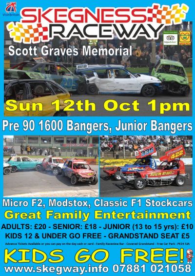 Details Bookings Meeting Format Prices, Times & More Last Updated: 20th September 2025 09:47 12th October 2025 PreviewPre 90 1600 Bangers, Junior Bangers, Micro F2, Modstox, Classic F1 Welcome to Skegness Raceway, for an Autumn Rumble in Memory of Scott Graves Racing today are the Pre 90 1600 Bangers for the Scott Graves Memorial, Junior Bangers, Micro F2, Modstox and Classic F1 Stock Cars. Advance Tickets are available or you can pay on the day, we have a large capacity we won't sell out. Grandstand seats are only available from the Trackshop just as you enter the raceway, sorry they are not available in advance. The Grandstand has over 1000 seats we don’t sell out. We are thrilled to be welcomed into the Trip Advisor Hall of Fame with our Certificate of Excellence and we have a 4.7 out of 5 rating on google. You really should be coming along to Skegness Raceway to be part of the excitement & fun that lots of people are talking about and have had a great time over the last few years. We are also members of Visit Britain and Visit England. Skegness Raceway is also home to the famous ‘SKEG VEGAS’ Sign. Skegness Raceway boast fantastic facilities New Home straight seated Covered Grandstand now open, see prices page for more details. Plus we also have a large free undercover Grandstand on the back straight, if you prefer to watch from outside, the arena is raised terracing so plenty of unhindered viewing. We also have Bars (including our family Raceview Bar, air con or heated), shops, catering, toilets, disabled toilets and baby changing facilities (located in the disabled toilets). We also have large tyres are banked in on each bend which do create a seating area. You are welcome to bring your own chairs. The seaside end allows a great area for wheelchair viewing. We have some ongoing improvements at the raceway, Please bear with us as we continue to upgrade the Raceway. It may be muddy under foot in various places. Sorry there isn’t a cash machine at the raceway, you can pay cash or card. Due to the Raceway location we struggle for a signal with mobile card machines at busy times. Large free carpark adjacent to the Raceway, please don’t in front of the ticket trailer There is full access to the pits Disabled parking is situated near the turnstiles (please don’t park in front of the turnstiles), would recommend early arrival to secure a space. Trackside parking no longer available (hasn’t been since 2017) and there is also no longer a bus service to the Raceway, we do have a free car park. Note. Large quantities of food and drink are not allowed to be brought in to the Stadium arena. You may enter the Stadium with a small amount of food and non- alcoholic beverage suitable for one person’s consumption ie. Sandwich, packet of crisps and bottle of soft drink. We will not allow cooler boxes, holdalls, shopping bags, backpacks etc. filled with refreshments. Nor will we allow trays, packs crates etc. of soft drinks. STRICTLY NO ALCOHOL or GLASS. Alcohol will be confiscated If you have specific dietary requirements for health reasons, please bring a confirmation letter with you from your GP. We race in all weather conditions. Well behaved dogs on leads are allowed to be brought into the venue. No tents, shelters, gazebos, marquee’s, pop up tents or similar are allowed inside the Stadium Arena. If you click on ‘Info’ on the website it gives full details on the Raceway including accessibility, formulas, stunts etc Gates Open: 11.30am Pitgate/office opens 10am Advance Tickets are available on www.skegway.info up to midnight on the 11th Oct then its all pay at the gate on the day. We have a large capacity we don’t sell out. Advance Tickets can’t be used in the Pit Office. Please note the Pit Office is also cash only. We have a new ticketing System in place. You will require to have the QR code scanned at the turnstiles As well as advance tickets you can pay at the gate on the day for all event at Skegness Raceway we have a large capacity we won’t sell out. Please follow the signs in the car park that will direct you to the Ticket Trailer where you can pay/ collect your advanced tickets. Prices Adult £20 Senior £18 Junior £10 (13yrs to 15yrs) 12 years and under as always go Free and can be added in advance Adults 16yrs and above, Senior’s 65yrs & over, Junior’s 13yrs to 15yrs Home Straight Covered Grandstand Seat £5 each (on top of admission price) for all, not bookable in advance. All require a seat including small children. There tickets can be purchased from the Trackshop at the turnstiles, sorry they are not available in advance. Card or cash can be used. Sorry there isn’t a cash machine at the raceway. Advance tickets are now available only online on www.skegway.info The event starts at 1pm with the turnstiles opening at 11.30am the event usually finishes between 5 and 5.30pm Trackside parking no longer available and there is also no longer a bus service to the stadium. We do have a large free car park Well behaved dogs on leads are allowed to be brought into the venue.