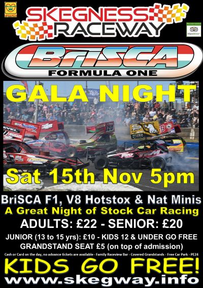 Details Bookings Meeting Format Prices, Times & More Last Updated: 15th October 2025 12:27 15th November 2025 previewBriSCA F1, National Ministox, BriSCA V8 Hotstox Welcome to Skegness Raceway for our last event of 2025 The BriSCA Gala Night. Please note this meeting is promoted by the BriSCA Management Board being held at Skegness Raceway. Featuring BriSCA F1, BriSCA V8 Hotstox and National Ministox Full racing Preview to follow. Including any info on any special races. Please note this is a pay on the day only event, no advanced tickets are available. Grandstand seats are only available from the Trackshop just as you enter the raceway, sorry they are not available in advance. The Grandstand has over 1000 seats we don’t sell out. We are thrilled to be welcomed into the Trip Advisor Hall of Fame with our Certificate of Excellence and we have a 4.7 out of 5 rating on google. You really should be coming along to Skegness Raceway to be part of the excitement & fun that lots of people are talking about and have had a great time over the last few years. We are also members of Visit Britain and Visit England. Skegness Raceway is also home to the famous ‘SKEG VEGAS’ Sign. Skegness Raceway boast fantastic facilities New Home straight seated Covered Grandstand now open, see prices page for more details. Plus we also have a large free undercover Grandstand on the back straight, if you prefer to watch from outside, the arena is raised terracing so plenty of unhindered viewing. We also have Bars (including our family Raceview Bar, air con or heated), shops, catering, toilets, disabled toilets and baby changing facilities (located in the disabled toilets). We also have large tyres are banked in on each bend which do create a seating area. You are welcome to bring your own chairs. The seaside end allows a great area for wheelchair viewing. We have some ongoing improvements at the raceway, Please bear with us as we continue to upgrade the Raceway. It may be muddy under foot in various places. Sorry there isn’t a cash machine at the raceway, you can pay cash or card. Due to the Raceway location we struggle for a signal with mobile card machines at busy times. Large free carpark adjacent to the Raceway, please don’t in front of the ticket trailer There is full access to the pits Disabled parking is situated near the turnstiles (please don’t park in front of the turnstiles), would recommend early arrival to secure a space. Trackside parking no longer available (hasn’t been since 2017) and there is also no longer a bus service to the Raceway, we do have a free car park. Note. Large quantities of food and drink are not allowed to be brought in to the Stadium arena. You may enter the Stadium with a small amount of food and non- alcoholic beverage suitable for one person’s consumption ie. Sandwich, packet of crisps and bottle of soft drink. We will not allow cooler boxes, holdalls, shopping bags, backpacks etc. filled with refreshments. Nor will we allow trays, packs crates etc. of soft drinks. STRICTLY NO ALCOHOL or GLASS. Alcohol will be confiscated If you have specific dietary requirements for health reasons, please bring a confirmation letter with you from your GP. We race in all weather conditions. Well behaved dogs on leads are allowed to be brought into the venue. No tents, shelters, gazebos, marquee’s, pop up tents or similar are allowed inside the Stadium Arena. If you click on ‘Info’ on the website it gives full details on the Raceway including accessibility, formulas, stunts etc Gates Open: 1.30pm Car Park & Pit and office opens 12.30pm Please note the Pit Office is cash only. Please follow the signs in the car park that will direct you to the Ticket Trailer where you can purchase your tickets cash or card, grandstand seats are available in the Trackshop as you enter the Raceway Prices Adult £22 Senior £20 Junior £10 (13yrs to 15yrs) 12 years and under as always go Free and can be added in advance Adults 16yrs and above, Senior’s 65yrs & over, Junior’s 13yrs to 15yrs Home Straight Covered Grandstand Seat £5 each (on top of admission price) for all, not bookable in advance. All require a seat including small children. There tickets can be purchased from the Trackshop at the turnstiles, sorry they are not available in advance. Card or cash can be used. Sorry there isn’t a cash machine at the raceway. Paid Practice for the cars racing 1.30pm to 4.30pm, £25 cash as you sign in the Pit Office The event starts at 5pm with the ticket trailer opening at 1.30pm the event usually finishes between 10pm and 10.30pm Trackside parking no longer available and there is also no longer a bus service to the stadium. We do have a large free car park Well behaved dogs on leads are allowed to be brought into the venue.