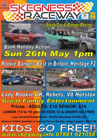 Details Bookings Meeting Format Prices, Times & More Last Updated: 26th May 2024 06:08 26th May 2024 PreviewRookie Bangers Best in Britian, BriSCA V8 Hotstox, Heritage F2, Lady Rookie Bangers UK Championship, Rebels Whit weekend Race Action Racing today are the Rookie Bangers for their Best in British Championship, BriSCA V8 Hotstox, Rebels, Heritage F2s and Lady Rookie Bangers (UK Championship Qualifing) All now pay on the day, we have a large capacity we won't sell out. New Large Seated Covered Grandstand (small extra charge not bookable just pay on the day) We don’t cancel due to a weather forecast We are thrilled to be welcomed into the Trip Advisor Hall of Fame with our Certificate of Excellence and we have a 4.7 out of 5 rating on google. You really should be coming along to Skegness Raceway to be part of the excitement & fun that lots of people are talking about and have had a great time over the last few years. We are also members of Visit Britain and Visit England. Skegness Raceway is also home to the famous ‘SKEG VEGAS’ Sign. Skegness Raceway boast fantastic facilities New Home straight seated Covered Grandstand now open, see prices page for more details. Plus we also have a large undercover Grandstand on the back straight, if you prefer to watch from outside, the arena is raised terracing so plenty of unhindered viewing. We also have Bars (including our family Raceview Bar, air con or heated), shops, catering, toilets, disabled toilets and baby changing facilities (located in the disabled toilets). We have no direct seating (yet), large tyres are banked in on each bend which do create a seating area. You are welcome to bring your own chairs. The seaside end allows a great area for wheelchair viewing. We have some ongoing improvements at the raceway, Please bear with us as we continue to upgrade the Raceway. Sorry there isn’t a cash machine at the raceway, you can pay cash or card but be aware we don’t have card machines in the bars and cash payment is quicker in the shops. Due to the Raceway location we struggle for a signal with mobile card machines. Large free carpark adjacent to the stadium There is limited access to the pits. If you require a pits wristband please go to the pit office before 1pm. Please note the Pit Office is cash only. Disabled parking is situated near the turnstiles (please don’t park in front of the turnstiles), would recommend early arrival to secure a space. Trackside parking no longer available (hasn’t been since 2017) and there is also no longer a bus service to the Raceway, we do have a free car park. Note. Large quantities of food and drink are not allowed to be brought in to the Stadium arena. You may enter the Stadium with a small amount of food and non- alcoholic beverage suitable for one person’s consumption ie. Sandwich, packet of crisps and bottle of soft drink. We will not allow cooler boxes, holdalls, shopping bags, backpacks etc. filled with refreshments. Nor will we allow trays, packs crates etc. of soft drinks. STRICTLY NO ALCOHOL or GLASS. Alcohol will be confiscated If you have specific dietary requirements for health reasons, please bring a confirmation letter with you from your GP. We race in all weather conditions. Well behaved dogs on leads are allowed to be brought into the venue. No tents, shelters, gazebos, marquee’s, pop up tents or similar are allowed inside the Stadium Arena. If you click on ‘Info’ on the website it gives full details on the Raceway including accessibility, formulas, stunts etc Rookie Bangers 2 Callum Walker 26 Ricky Hodson 36 Brandon Pesterfield 44 Craig Law 49 Jack Coupland 57 Georgie Boult jnr 69 Jacob Clapham 88 Lyndon Stark 95 Dylan Gamble 112 Daniel Field 206 Mikey Mylet 211 Joe Couldwell 223 Shane Batey 319 Leigh Dodes 321 John Weir 356 Sam Hillden 363 Jordan Pesterfield 369 Ryan Armstrong 444 Harvey Law 453 Ben Baum 709 Ben Kaleta 818 Lewis O'Keefe 875 Clinton Haw 888 Lloyd Stark V8 Hotstox 10 Gilen Bullock 29 Gracie Squire 110 Evan Bullock (P) 146 Grant Leather 167 Molly Robson 171 Tom Dunne 176 Stephen Young 182 William Cheetham 212 Martyn Box (p) 222 Guy Jolly 262 Camey Dorrell 282 Elliot Fletcher 288 Jon Brown 296 Dan Poole 304 Nathan Topliff 328 Michael Boswell 355 Bryan Andrew 376 Matthew Young 507 Luke Smith 525 Amy Jagger 577 Lee Allen Rebels 1 Gary Tagg 8 Dave Morley 20 AJ Davis 30 Rob Jones 55 Harry Graham 63 Scott Worville 66 Steve Willis 80 Keith Murphy 81 Shay Murphy 82 Ashley Geary 90 Liam Brown 91 Matt McClure 131 Nicole Emmett 159 Jon Cooper 175 Owen Gregory 193 Arron Chave 281 Katie Harris 365 Liam Conway 409 Carl Pears 468 Bradley Cooper 475 Ryan Gregory 477 Ben Allen 491 John Gould 513 Jack Charlesworth 711 Owen Eyre 905 Danny Maddox Heritage F2 15 John Plater 22 Will Yarrow 27 Jack Helliwell 47 Giles Carter 49 Paul Ferguson 50 Mark Foster 105 Jake Anderson 135 Jim Cannon 143 Ian Dominey 156 Leigh Dixon 157 Kevan Woollas 170 Dean Griffiths 186 Karl Bradley 198 Alan Nicholson 271 Wayne Helliwell 342 Eddie McTaylor 424 Mike Heywood 425 Sam Whiteley 517 Dan Cooper 533 Andy Kaye 537 Charlie Barnes 555 David Speed 710 Vince Stone 734 Richie Yarrow 736 Scott Douglas 761 Andy Whitehouse 773 Nick Whitney J50 Mathew Foster Lady Rookie Bangers 32 April bellamy 43 Kirsty bishop 44 Ellie-May Law 57 Sophie Tillow 69 Jemma Cartwright 73 Sam Hall 151 Lexi List 193 Lauren Atkinson 251 Chloe Wietrzyk 644 Diamond Marie 710 Kayleigh Seymour-Smalley 799 Charleigh curle 990 Jordan-Leanne smith Sunday 26th May 1pm 1. BriSCA V8 Hotstox Heat 1 2. Rebels Heat 1 3. Heritage F2 Heat 1 4. Lady Rookie Bangers Heat 1 5. Rookie Bangers Heat 1 6. BriSCA V8 Hotstox Heat 2 7. Rebels Heat 2 8. Heritage F2 Heat 2 9. Lady Rookie Bangers Heat 2 10. Rookie Bangers Heat 2 11. BriSCA V8 Hotstox Final 12. Rebels Final 13. Heritage F2 Andy Webb Memorial 14. Lady Rookie Bangers Heat 3 15. Rookie Bangers Final 16. BriSCA V8 Hotstox GN 17. Rebels GN 18. Rookie Bangers (if required) Format subject to chang