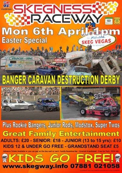 Details Bookings Meeting Format Prices, Times & More Last Updated: 03rd March 2026 12:51 6th April 2026 PreviewRookie Bangers English Championship, Modstox, Junior Rods, Supers Twos Welcome to Skegness Raceway, for an Easter Special! And for the first time this year Our Famous CARAVAN BANGERS DESTRUCTION DERBY!! Its going to be mad, and it’s the last race of the day so don’t leave early! Racing today are Rookie Bangers English Championship, Modstox Super Twos and the kids in Junior Rods Advance Tickets are available or you can pay on the day, we have a large capacity we won't sell out. Grandstand seats are only available from the Trackshop just as you enter the raceway, sorry they are not available in advance. The Grandstand has over 1000 seats we don’t sell out. We are thrilled to be welcomed into the Trip Advisor Hall of Fame with our Certificate of Excellence and we have a 4.7 out of 5 rating on google. You really should be coming along to Skegness Raceway to be part of the excitement & fun that lots of people are talking about and have had a great time over the last few years. We are also members of Visit Britain and Visit England. Skegness Raceway is also home to the famous ‘SKEG VEGAS’ Sign. Skegness Raceway boast fantastic facilities New Home straight seated Covered Grandstand now open, see prices page for more details. Plus we also have a large free undercover Grandstand on the back straight, if you prefer to watch from outside, the arena is raised terracing so plenty of unhindered viewing. We also have Bars (including our family Raceview Bar, air con or heated), shops, catering, toilets, disabled toilets and baby changing facilities (located in the disabled toilets). We also have large tyres are banked in on each bend which do create a seating area. You are welcome to bring your own chairs. The seaside end allows a great area for wheelchair viewing. We have some ongoing improvements at the raceway, Please bear with us as we continue to upgrade the Raceway. It may be muddy under foot in various places. Sorry there isn’t a cash machine at the raceway, you can pay cash or card. Due to the Raceway location we struggle for a signal with mobile card machines at busy times. Large free carpark adjacent to the Raceway, please don’t in front of the ticket trailer There is limited Access to the pits, If you require a Pits Wristband please go to the Pit Office before 1pm and note the Pits Office is cash Only. Disabled parking is situated near the turnstiles (please don’t park in front of the turnstiles), would recommend early arrival to secure a space. Trackside parking no longer available (hasn’t been since 2017) and there is also no longer a bus service to the Raceway, we do have a free car park. Note. Large quantities of food and drink are not allowed to be brought in to the Stadium arena. You may enter the Stadium with a small amount of food and non- alcoholic beverage suitable for one person’s consumption ie. Sandwich, packet of crisps and bottle of soft drink. We will not allow cooler boxes, holdalls, shopping bags, backpacks etc. filled with refreshments. Nor will we allow trays, packs crates etc. of soft drinks. STRICTLY NO ALCOHOL or GLASS. Alcohol will be confiscated If you have specific dietary requirements for health reasons, please bring a confirmation letter with you from your GP. We race in all weather conditions. Well behaved dogs on leads are allowed to be brought into the venue. No tents, shelters, gazebos, marquee’s, pop up tents or similar are allowed inside the Stadium Arena. If you click on ‘Info’ on the website it gives full details on the Raceway including accessibility, formulas, stunts etc Gates Open: 11am Pitgate/office opens 10am Advance Tickets are available on www.skegway.info up to midnight on the 5th April then its all pay at the gate on the day. We have a large capacity we don’t sell out. Advance Tickets can’t be used in the Pit Office. Please note the Pit Office is also cash only. We have a new ticketing System in place. You will require to have the QR code scanned at the turnstiles As well as advance tickets you can pay at the gate on the day for all event at Skegness Raceway we have a large capacity we won’t sell out. Please follow the signs in the car park that will direct you to the Ticket Trailer where you can pay/collect your advanced tickets. Prices Adult £20 Senior £18 Junior £10 (13yrs to 15yrs) 12 years and under as always go Free and can be added in advance Adults 16yrs and above, Senior’s 65yrs & over, Junior’s 13yrs to 15yrs Home Straight Covered Grandstand Seat £5 each (on top of admission price) for all, not bookable in advance. All require a seat including small children. There tickets can be purchased from the Trackshop at the turnstiles, sorry they are not available in advance. Card or cash can be used. Sorry there isn’t a cash machine at the raceway. Advance tickets are now available only online on www.skegway.info The event starts at 1pm with the turnstiles opening at 11am the event usually finishes between 5 and 5.30pm Trackside parking no longer available and there is also no longer a bus service to the stadium. We do have a large free car park Well behaved dogs on leads are allowed to be brought into the venue.